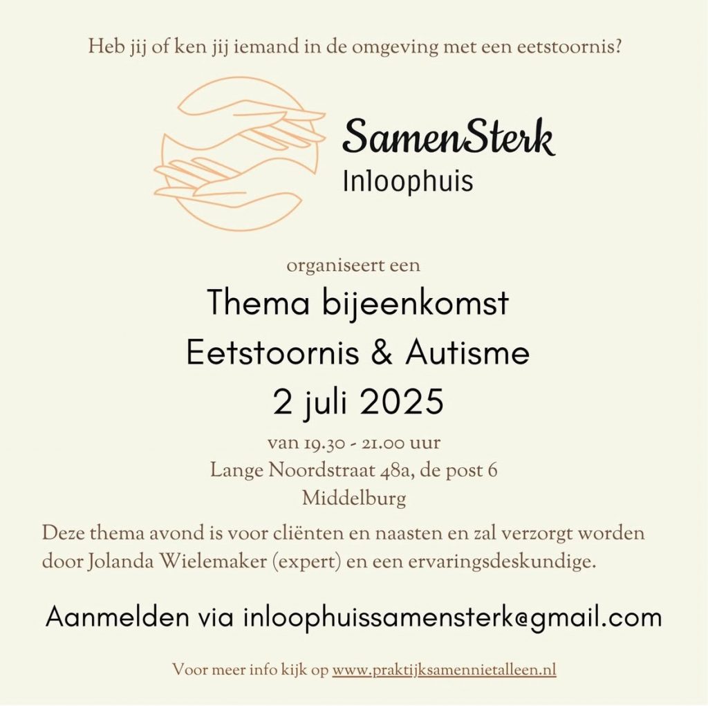 Naast de reguliere inloopavonden vinden wij het belangrijk om aandacht te hebben voor verschillende thema’s. Denk hierbij aan de naasten van mensen met eetproblemen. Professionals die graag meer kennis willen over eetproblematiek en vroege signalering. Ook thema’s als eetstoornissen en ASS, eetstoornissen en trauma enz willen we graag meer aandacht aan besteden en zullen dan ook regelmatig plaatsvinden in de avonden.